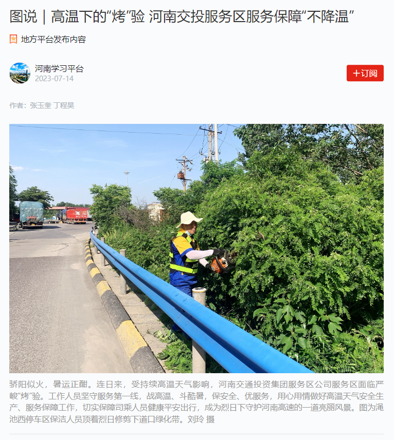 7月14日,“學習強國河南學習平臺” 以“高溫下的’烤’驗 河南交投服務區服務保障‘不降溫‘”為題,對公司所屬服務區、加油站做好高溫天氣安全生產、服務保障工作進行了宣傳報道。