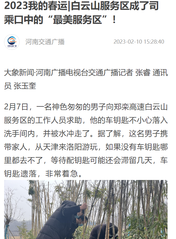 大象新聞、今日頭條、河南交通廣播:2023我的春運|白云山服務區成了司乘口中的“最美服務區”!(改)